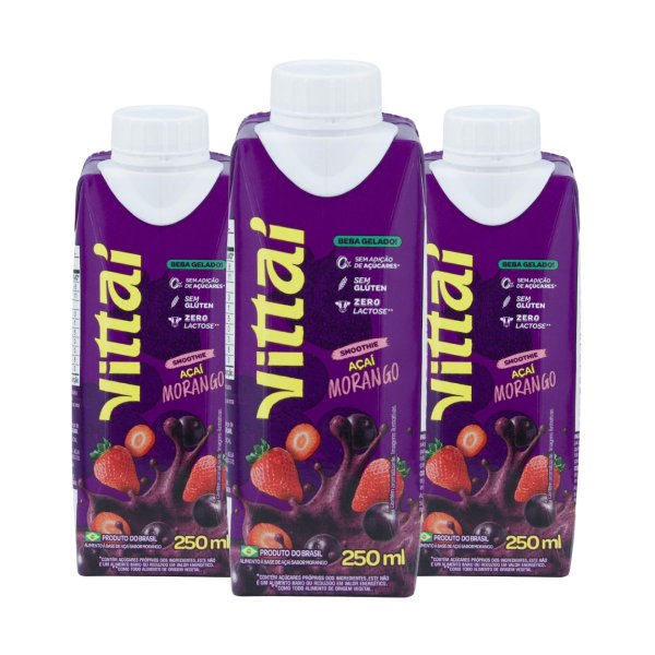 Kit com 3 Smoothies Vittaí Açaí Sabor Morango 250ml Sem lactose, Sem glúten e 0 açúcar